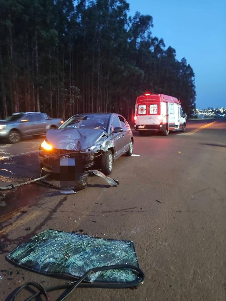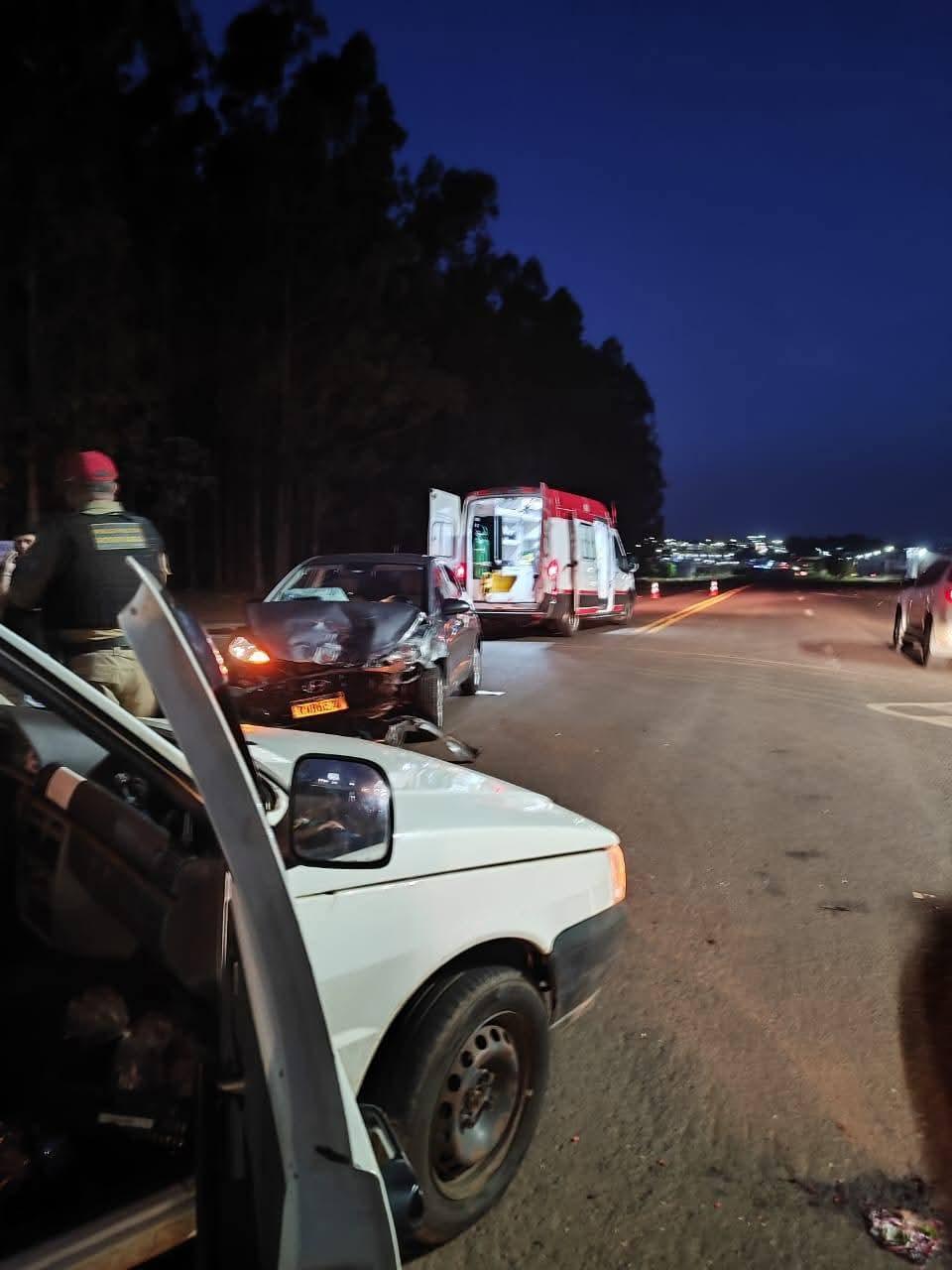 A colisão envolveu um Hyundai HB20, com placas de Campo Grande (MS), e uma Fiat Fiorino, de Cascavel.