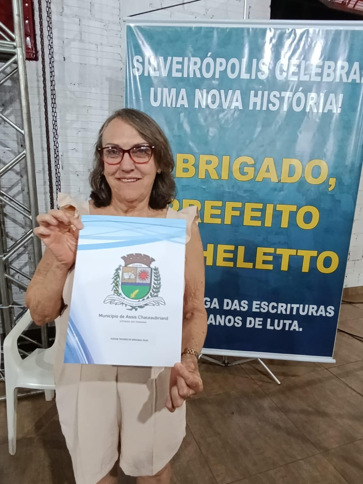 Nesta última quinta-feira (27), a Prefeitura de Assis Chateaubriand, em parceria com o Tribunal de Justiça do Paraná (TJPR) e a empresa Propriedade Legal, realizou a entrega oficial de títulos de registro de imóveis para 161 famílias residentes no Patrimônio de Silveirópolis. A ação faz parte do Programa de Regularização Fundiária "Moradia Legal", que tem como objetivo principal garantir segurança jurídica e cidadania aos beneficiários e aconteceu no Salão Comunitário do Patrimônio.