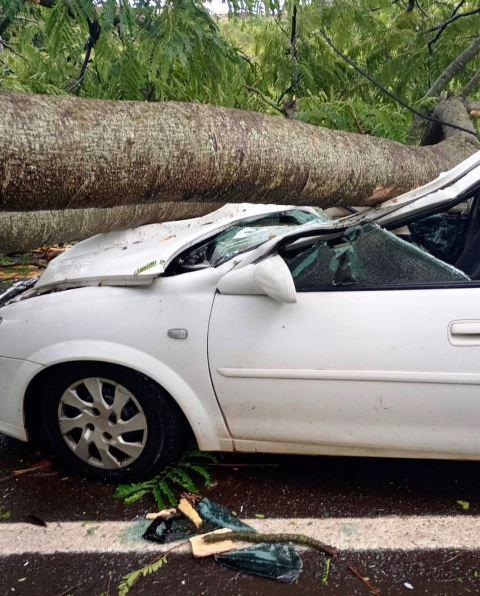 As imagens do local chamam a atenção pela gravidade do impacto. Um dos galhos atravessou o veículo, passando muito próximo de regiões vitais do condutor, como o peito e a cabeça. O carro teve danos de grande monta.