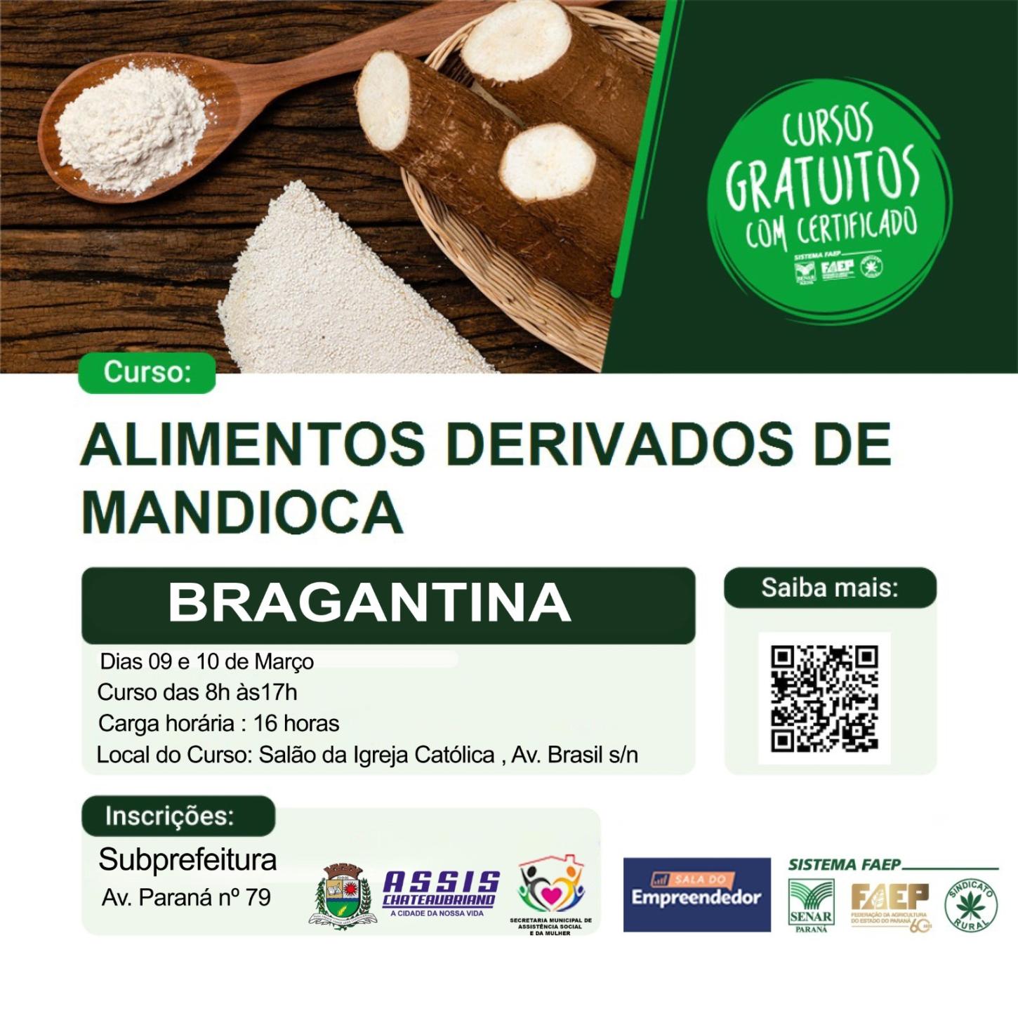 No distrito de Bragantina também acontecerá o Curso de Derivados de Mandioca. As inscrições devem ser efetivas na Subprefeitura e o mesmo acontece nos dias 9 e 10 de março no Salão da Igreja Católica de Bragantina, das 8h às 17h.