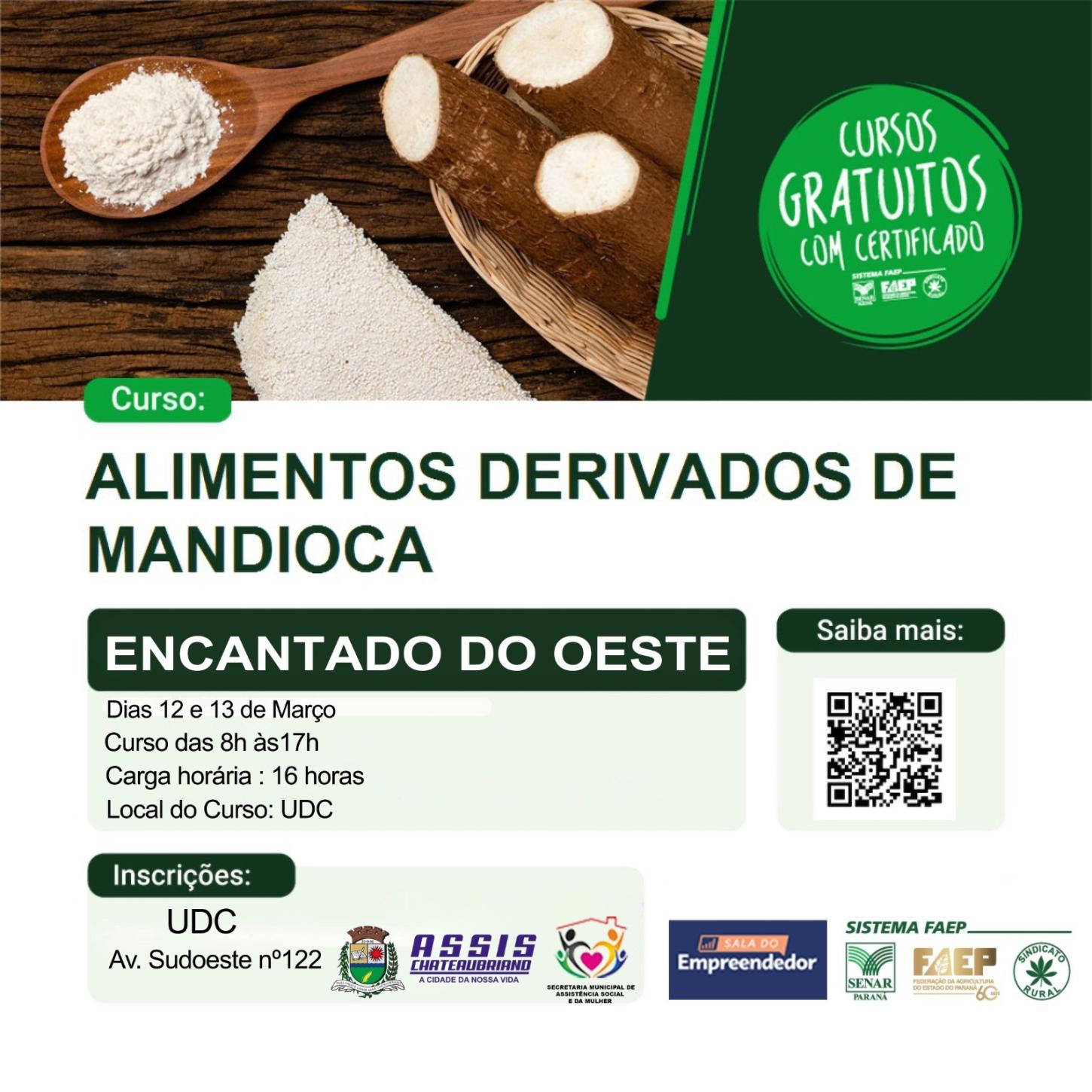 O Município de Assis Chateaubriand informa que estão abertas as inscrições para Cursos de Derivados de Mandioca, que serão realizados no Patrimônio do Silveiropólis, nos dias 2 e 3 de março, e deverão ser feitas no Posto de Saúde da localidade. O treinamento ocorrerá no Salão Comunitário do Silveiropólis, das 8h às 17h