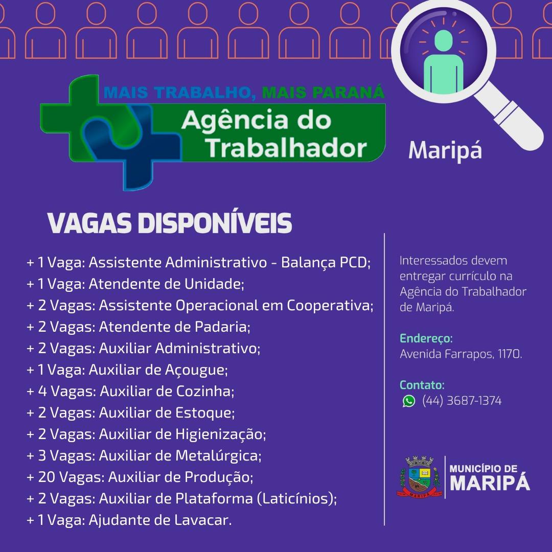 A Agência do Trabalhador de Maripá divulgou as vagas disponíveis de emprego nesta quinta-feira (23). Para saber mais, entre em contato com a Agência do Trabalhador pelo telefone (44) 3687-1374, ou no endereço Avenida Farrapos, nº 1170, em Maripá-PR.