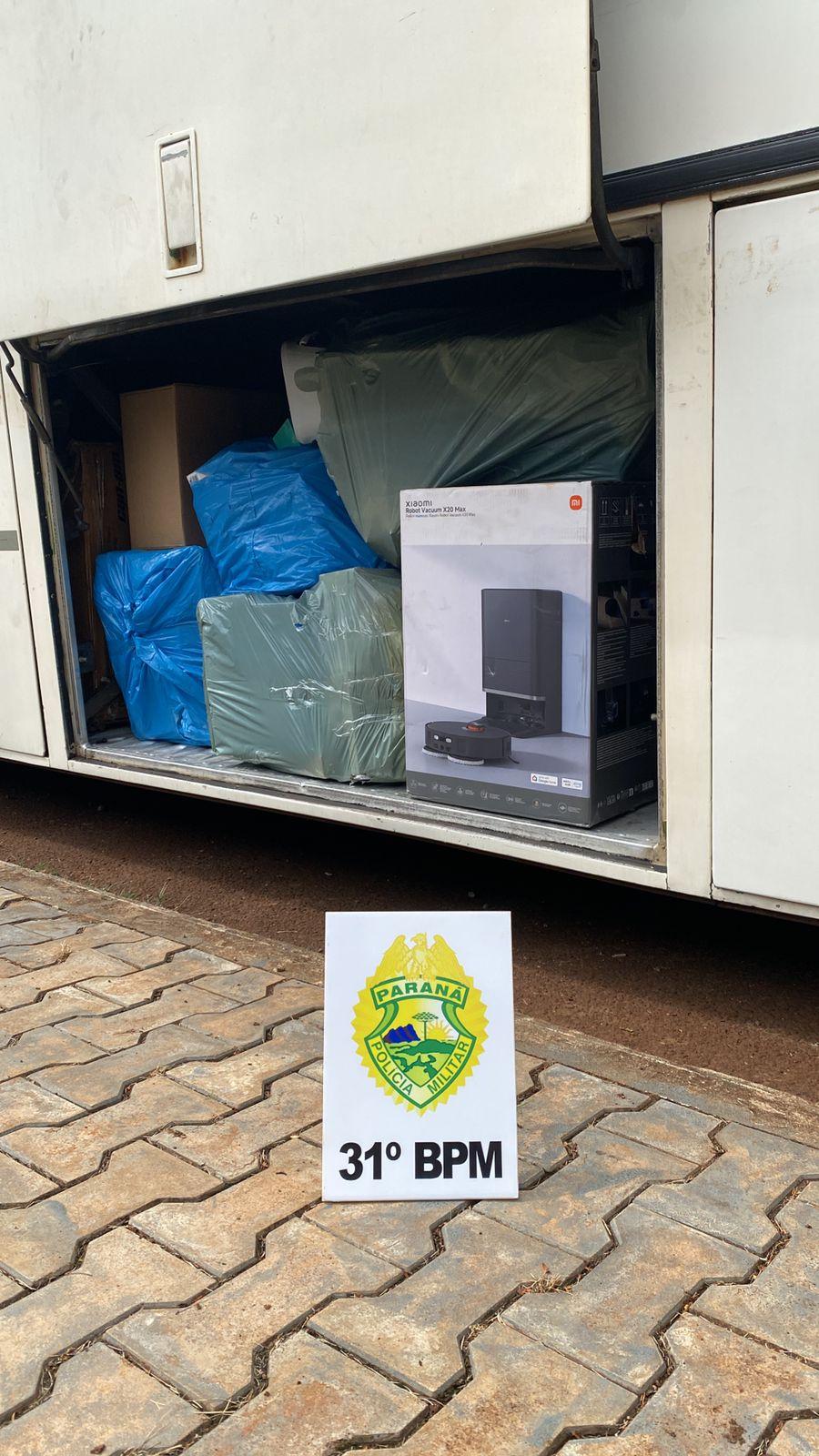 Durante a fiscalização, foi constatado que o veículo transportava diversos passageiros e grande quantidade de volumes no compartimento de bagagens e no interior do ônibus. Após verificação preliminar, foram localizados diversos produtos de origem estrangeira, entre eles eletrônicos, brinquedos, perfumes e robôs de limpeza.
