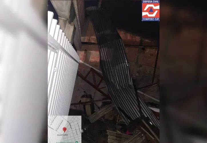 Em outra residência, a estrutura da cobertura não suportou a pressão do vento e desabou sobre um automóvel que estava na garagem. As vigas metálicas foram retorcidas como se fossem de papel, prendendo o veículo sob os escombros.
