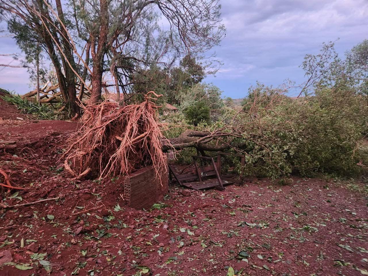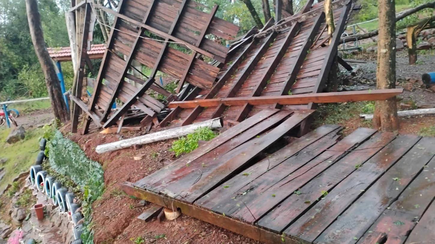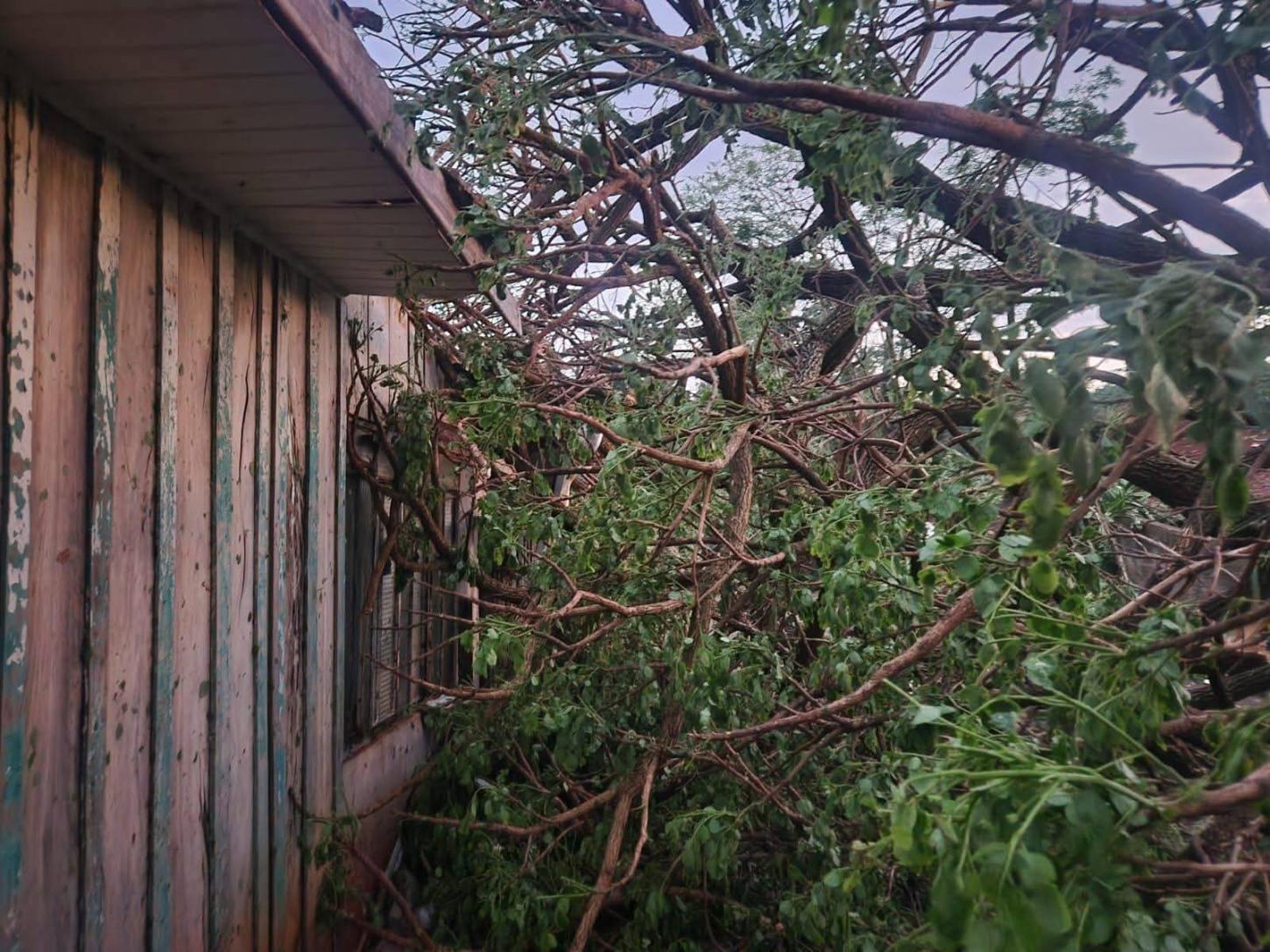 Diversas árvores de grande porte foram derrubadas pela força do vento, atingindo estruturas e destruindo um espaço de lazer utilizado por moradores da comunidade.